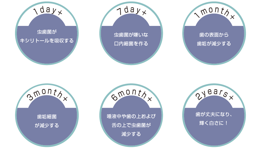 ④継続することで、糖分を摂取しても虫歯の原因となる酸を作らない口内環境を整え、虫歯を予防することができます。キシリトールを継続して摂取した場合